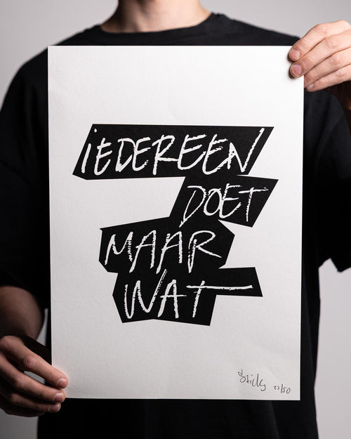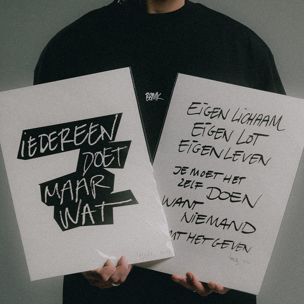 Sneakerstore BijSMAAK en rapper Sticks gaan al enkele jaren samen onder het label BSMK & STICKS. Samen droppen we fashion van hoge kwaliteit met designs gebaseerd op het handgeschreven werk van onze favorieten uit de Nederlandse hiphopscene.